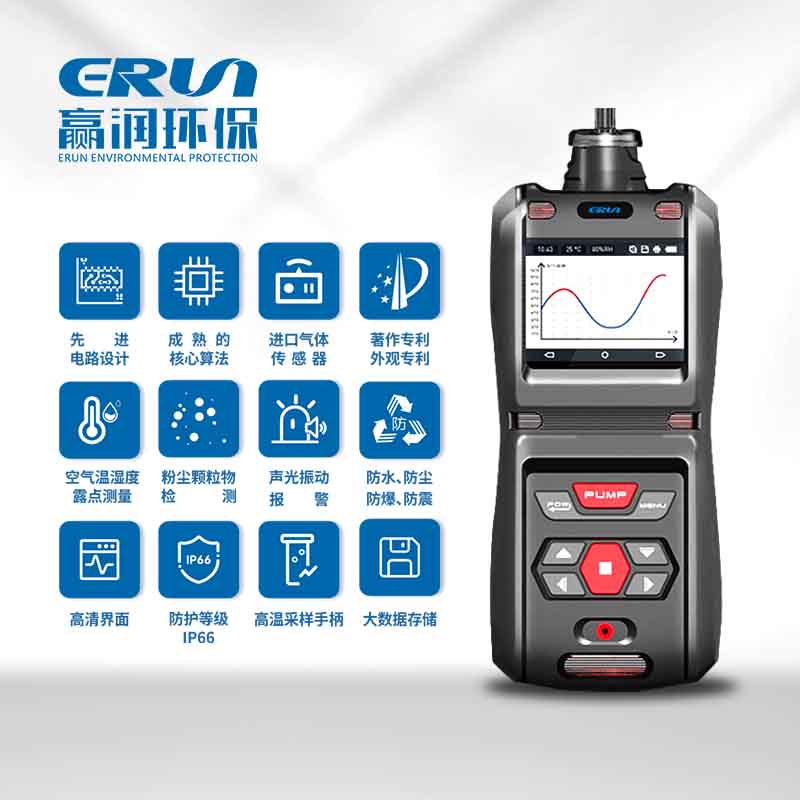 贏潤環(huán)保研發(fā)生產(chǎn)的手持式泵吸型乙烷C2H6氣體檢測儀ERUN-PG71S5-M4能檢測并顯示乙烷C2H6氣體的濃度值,也可以配備溫度、濕度測量功能,檢測氣體種類超過500余種(檢測氣體種類可根據(jù)客戶需求組合配置)。
