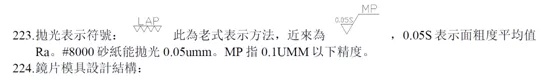 165.當(dāng)3D 寸法公差為單向公差時,應(yīng)向客戶檢討,盡量調(diào)為雙向公差﹔對大面積肉薄部品為保證成形厚度,采用追加澆口﹔有時表面不能拋太光,特別是作鏡面時,會粘住離型不良,#5000 就會發(fā)生真空凝質(zhì),可再拋粗一些﹔做光學(xué)鏡片的材料,鋼材應(yīng)含鎳15%以上。